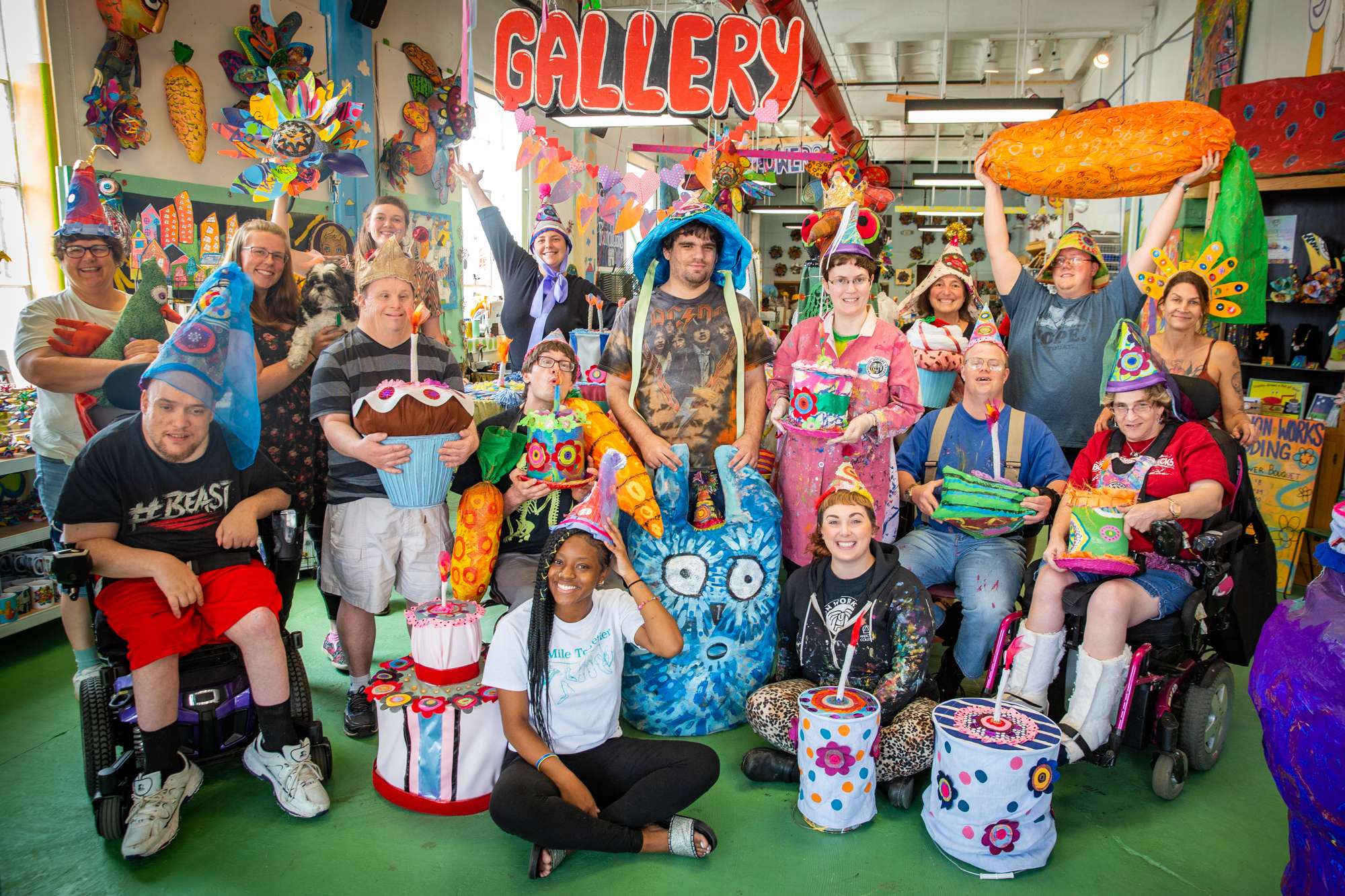 Passion Works artists work on pieces to be displayed at the Nelsonville Music Festival at the studio in Uptown Athens, Ohio on June 3, 2019.