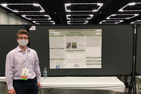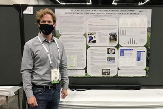 "My fieldwork ranged from having your arm two feet deep into wetland soil during a rainstorm to typing Python code in your PJs driving across Korea,” said Linville, who presented his work with Lee on "Quantification of biogas emissions from a groundwater-dependent ecosystem through novel field and laboratory methods."
