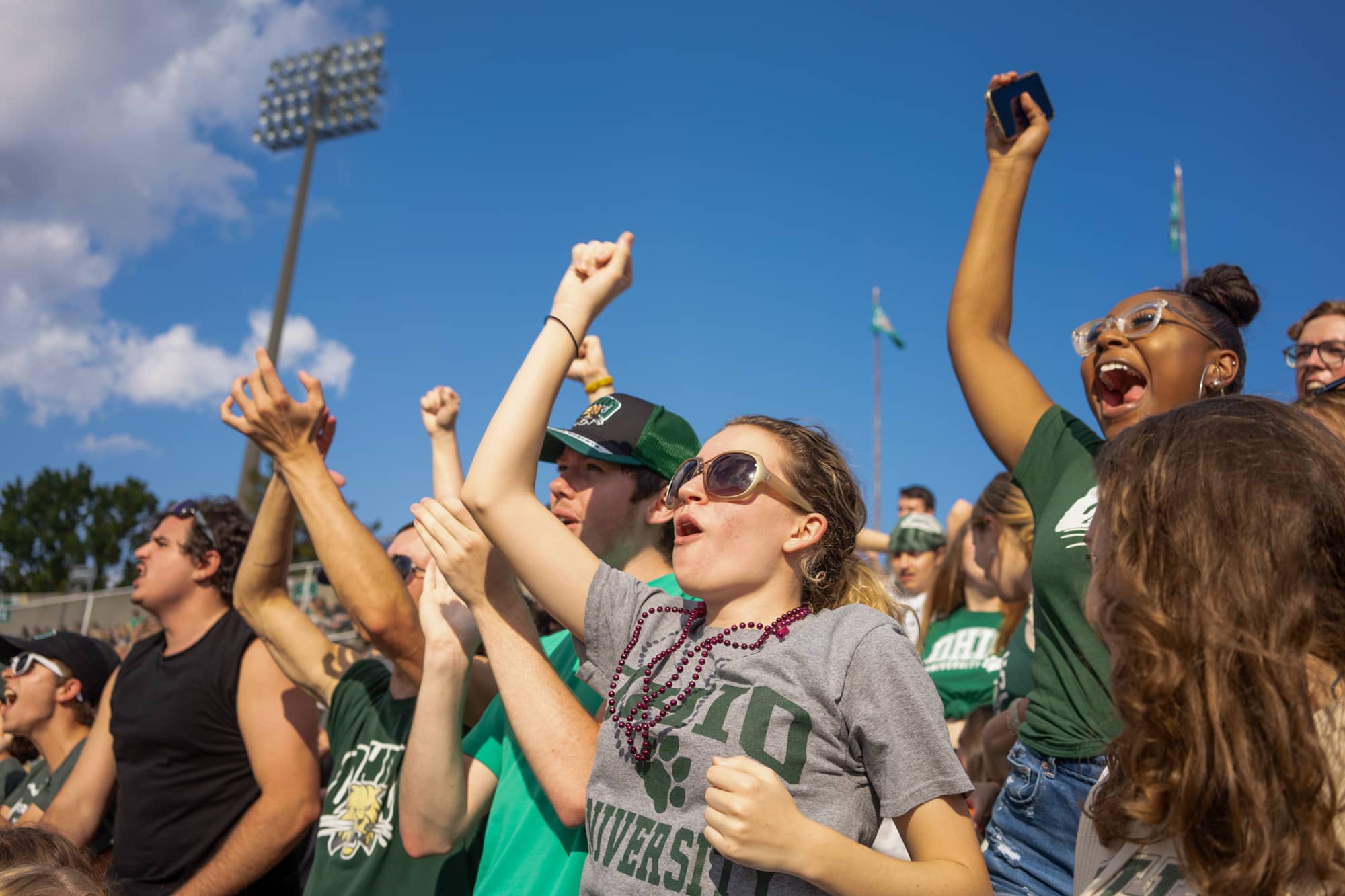 Fans cheer on the Ohio University football team at Peden Stadium in Athens, Ohio, on Saturday, October 9, 2021.