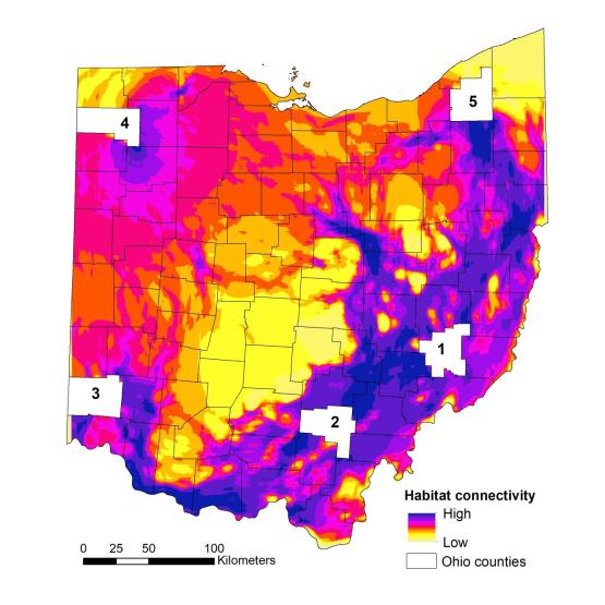 Tracking that rebound means that identifying and mapping areas of high and low connectivity, along with so-called “pinch-points,” or narrow corridors that allow dispersal within inhospitable habitat, can be critical for management decisions to maintain a viable population. The researchers used habitat suitability maps to build connectivity maps between core and peripheral areas of Ohio.