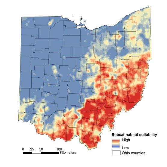 The one area where the models predicted low or no suitability is central Ohio, which is dominated by heavy agriculture and lacks natural habitats that bobcats can use.