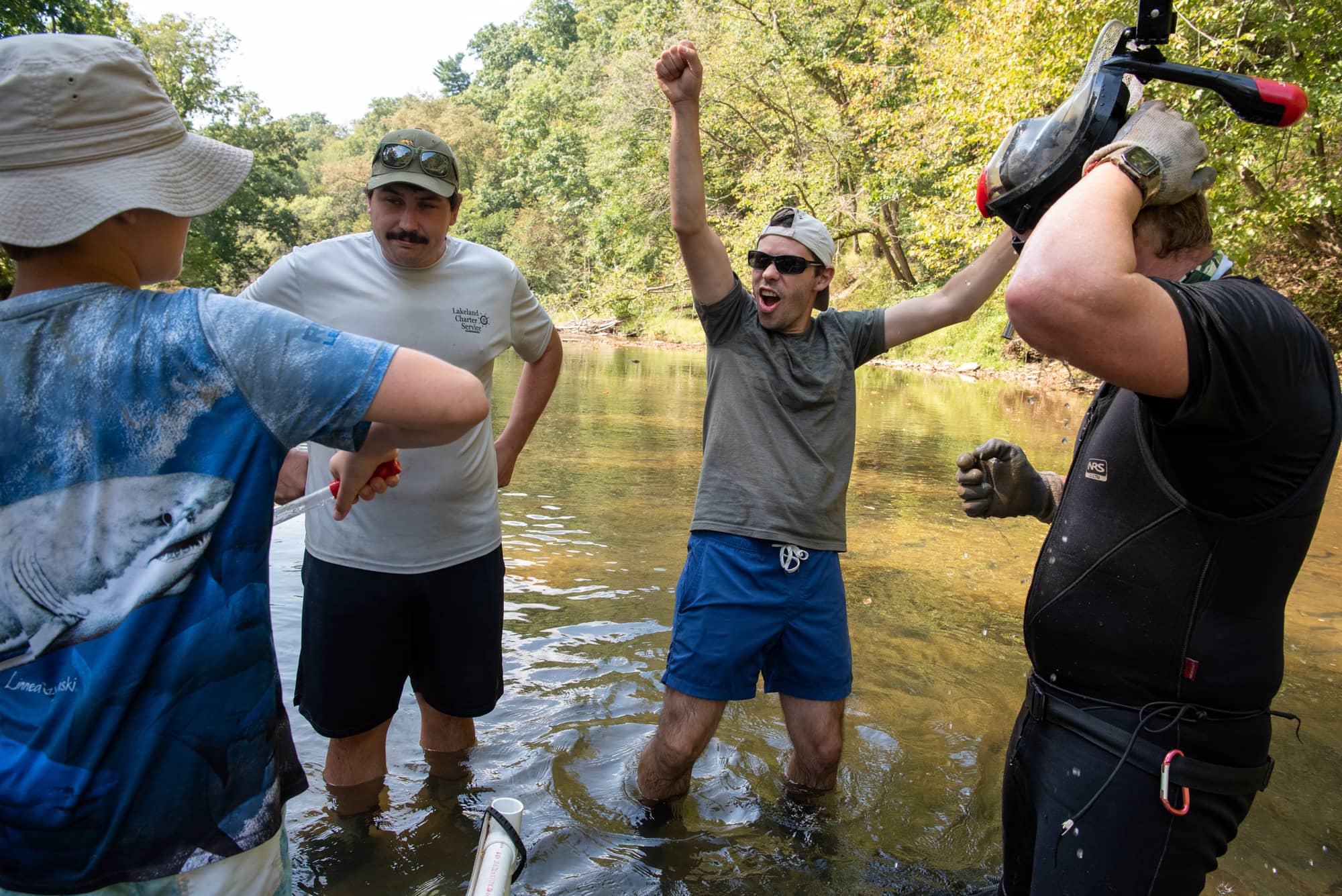 Arts and Sciences Associate Professor of Biology Viorel Popescu, Ph.D., center, reacts while collecting Eastern hellbender eggs from a wild nest in Pennsylvania. The Eastern hellbender, one of North America’s largest salamanders, is a fully aquatic species and an indicator of stream health. Counting eggs and monitoring the success of wild nests is part of an ongoing research program at OHIO aimed at conserving these threatened animals and the streams that they depend on.