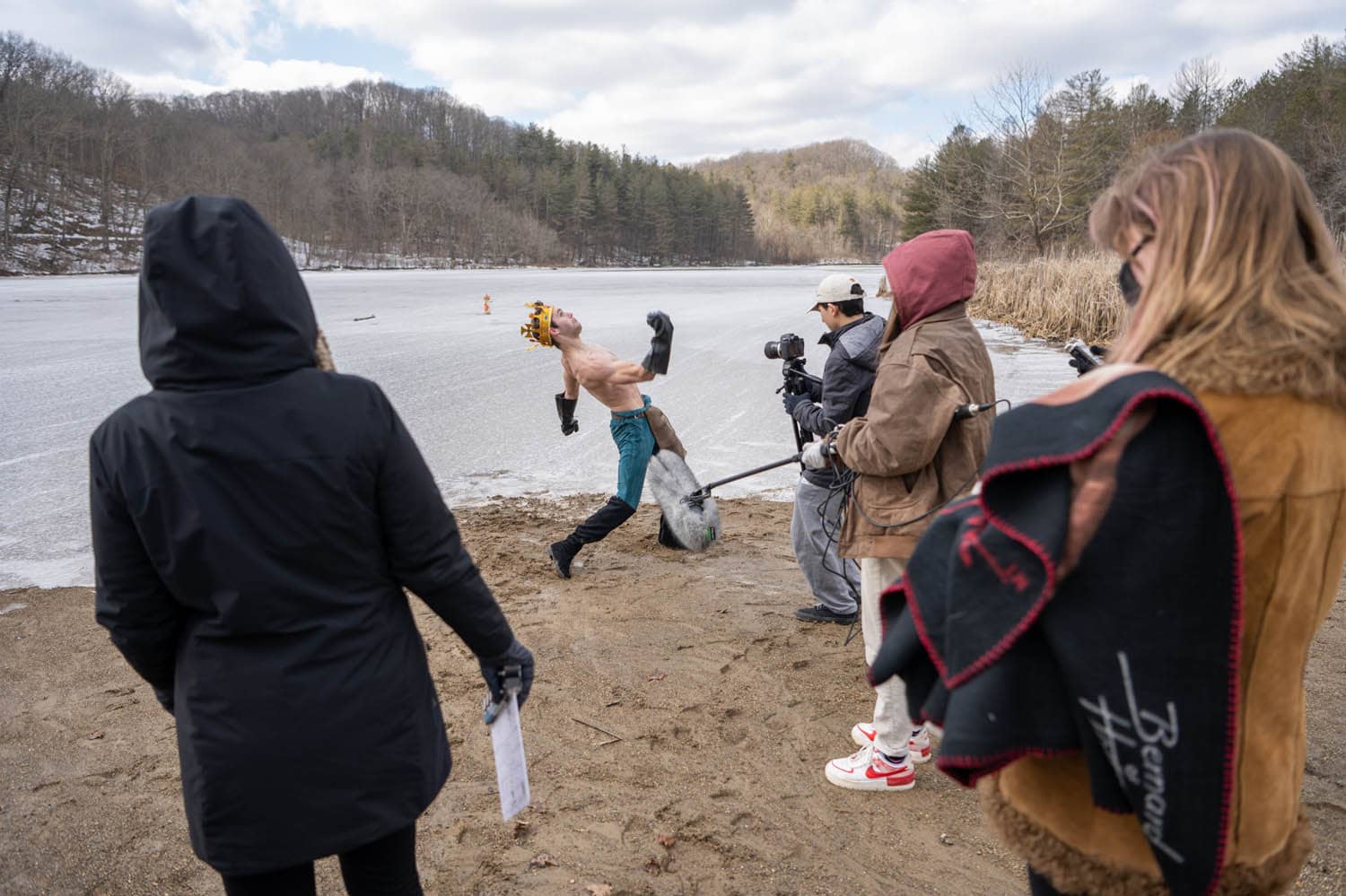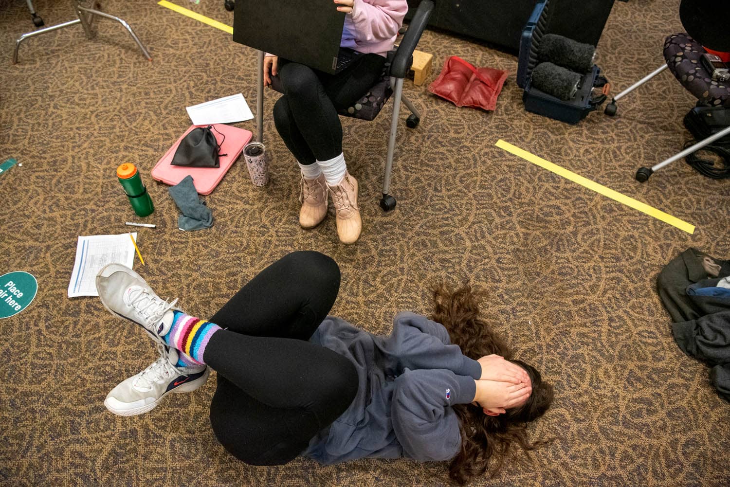 Aaron Bryan, Maria Gian, Gabriel Antonuccio and Harley Hernandez prepare to film a portion of the first scene of their video at 11:21 a.m. during the 48-Hour Shootout at Ohio University on Saturday, Feb. 12, 2022, in Athens, Ohio.