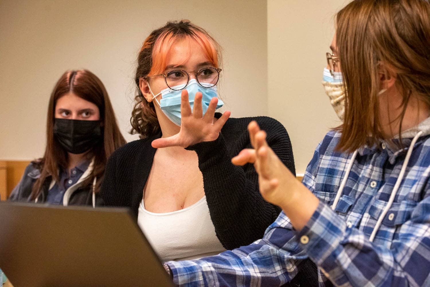 Kaitlyn Kilmer and Meg Sharp collaborate on writing the script for their team’s short film for Ohio University’s annual 48-Hour Shootout on Feb. 11, 2022. The team’s five-minute film, “Thank Y’all”, an office-based Western, did not place in the final contest but racked up thousands of views on YouTube within days after its completion.