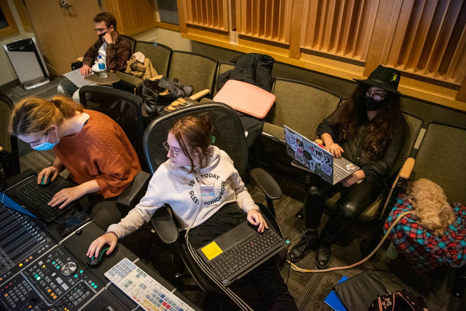 Director Akira Jakkson adds closing credits in Adobe Premiere Pro on the morning of Sunday, Feb. 13, 2022. The editing crew of Team Movie met up in the Media Arts and Studies recording lab in Schoonover Center. With only hours to go before the deadline, the team is exhausted, focused and caffeinated.