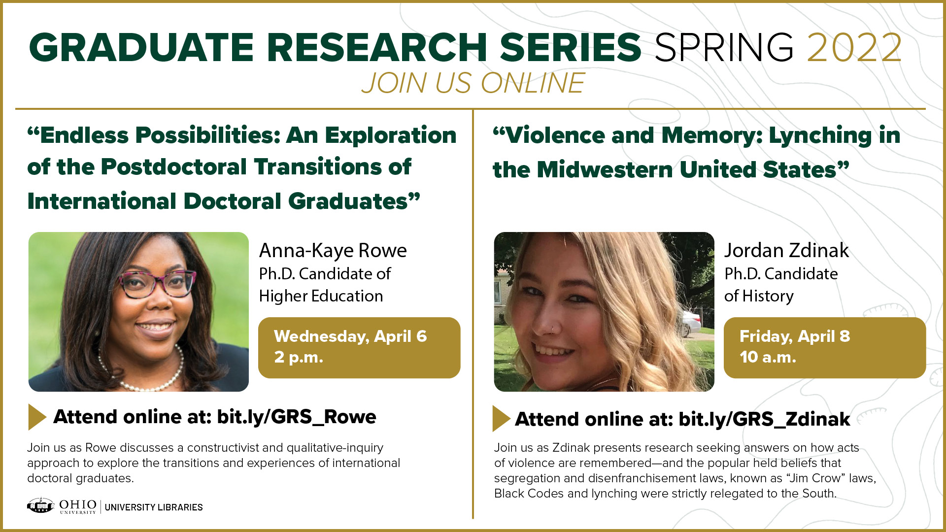 The Graduate Research Series (GRS) is hosted annually by Ohio University Libraries to provide an opportunity for graduate students to share their research process for their thesis or dissertation. For spring semester 2022, the two talks in the series will take place on April 6 at 2 p.m. and April 8 at 10 a.m. Both will take place on Microsoft Teams and are open to the public.