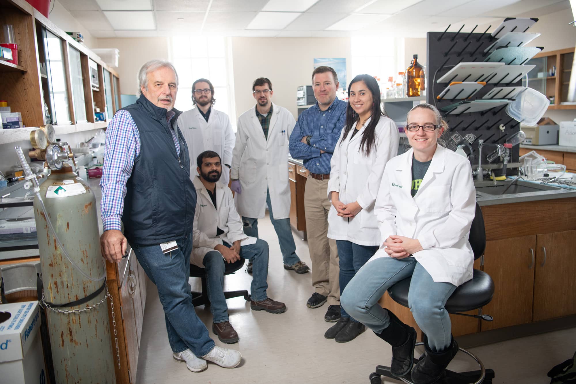 Dr. John Kopchick poses for a photo with his team at the Edison Biotechnology Institute.