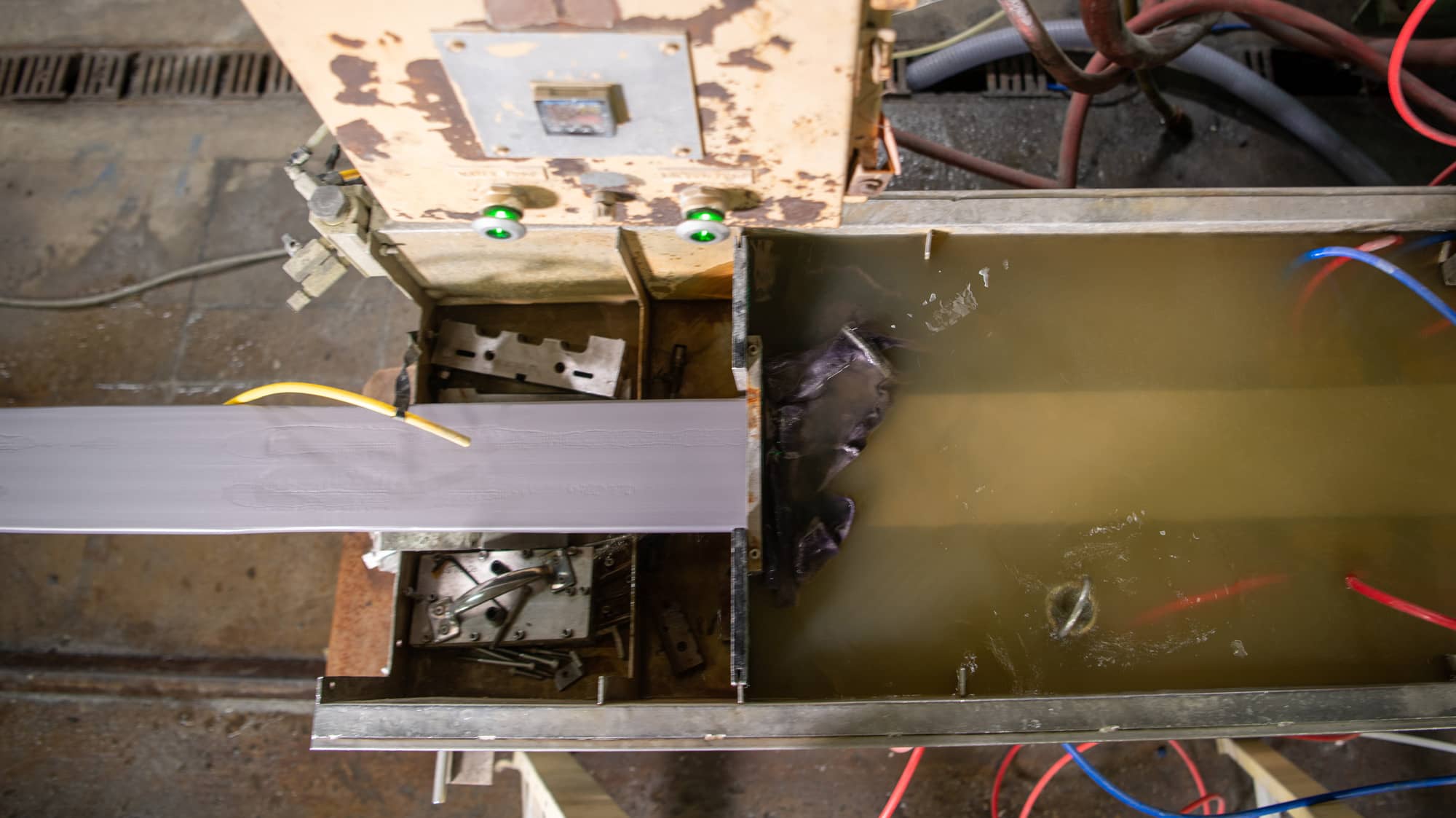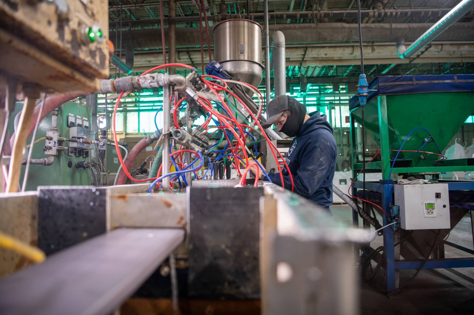 An employee of Engineered Profiles produces a deck board comprised mostly of coal waste.