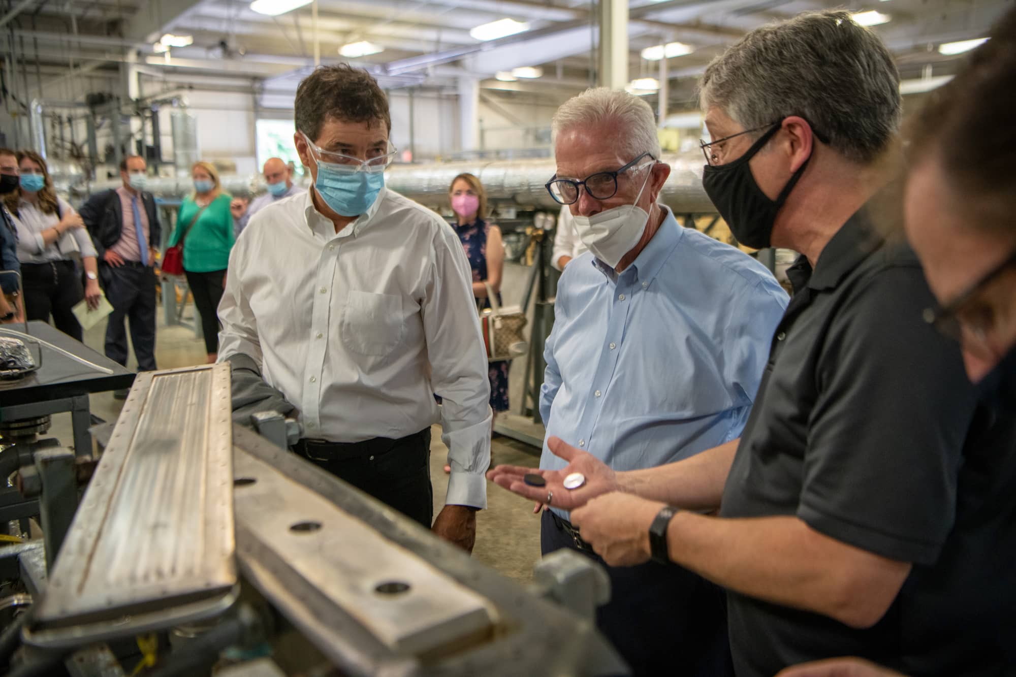 Congressmen Troy Balderson (left) and Bill Johnson (center) speak with Dr. Bruce Brown at the Institute for Corrosion and Multiphase Technology to learn more about the institute's economic impact on the region.