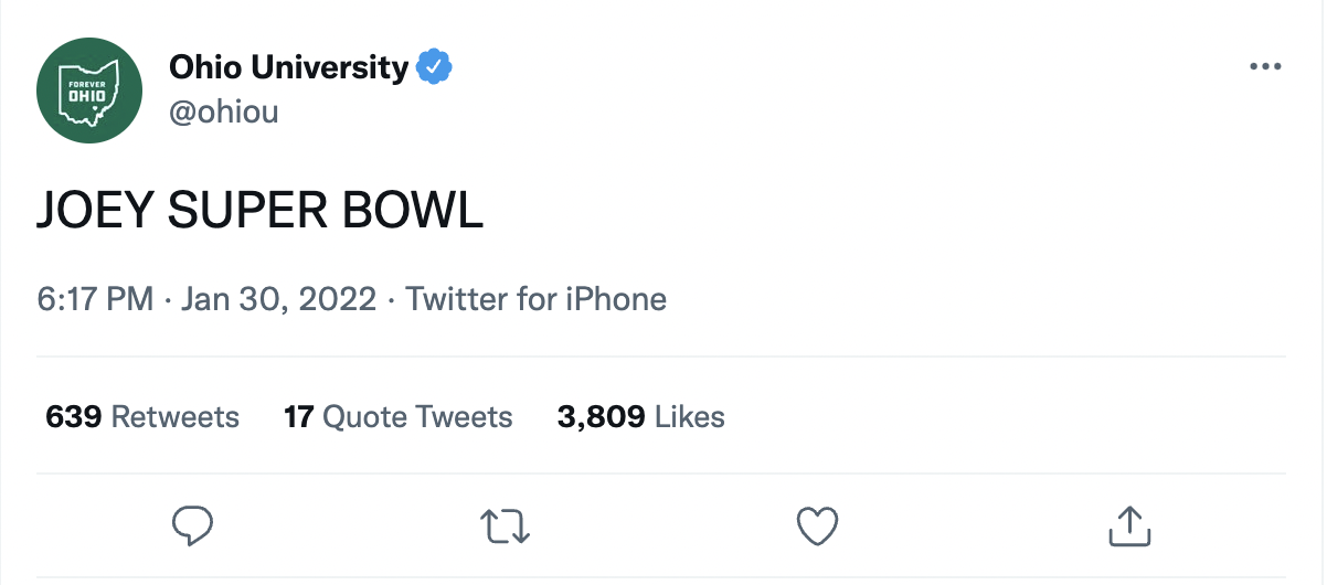 In the Rival IQ release, OHIO was also the featured university account for Twitter. With an engagement rate two times more than the Higher Ed median, OHIO was applauded for creating content that Bobcats understood and highlighting user-generated content.