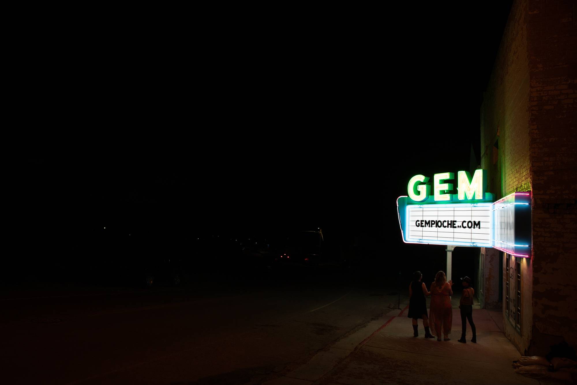 Melissa Clary speaks with friends while looking at the Gem Theater sign after the Gem