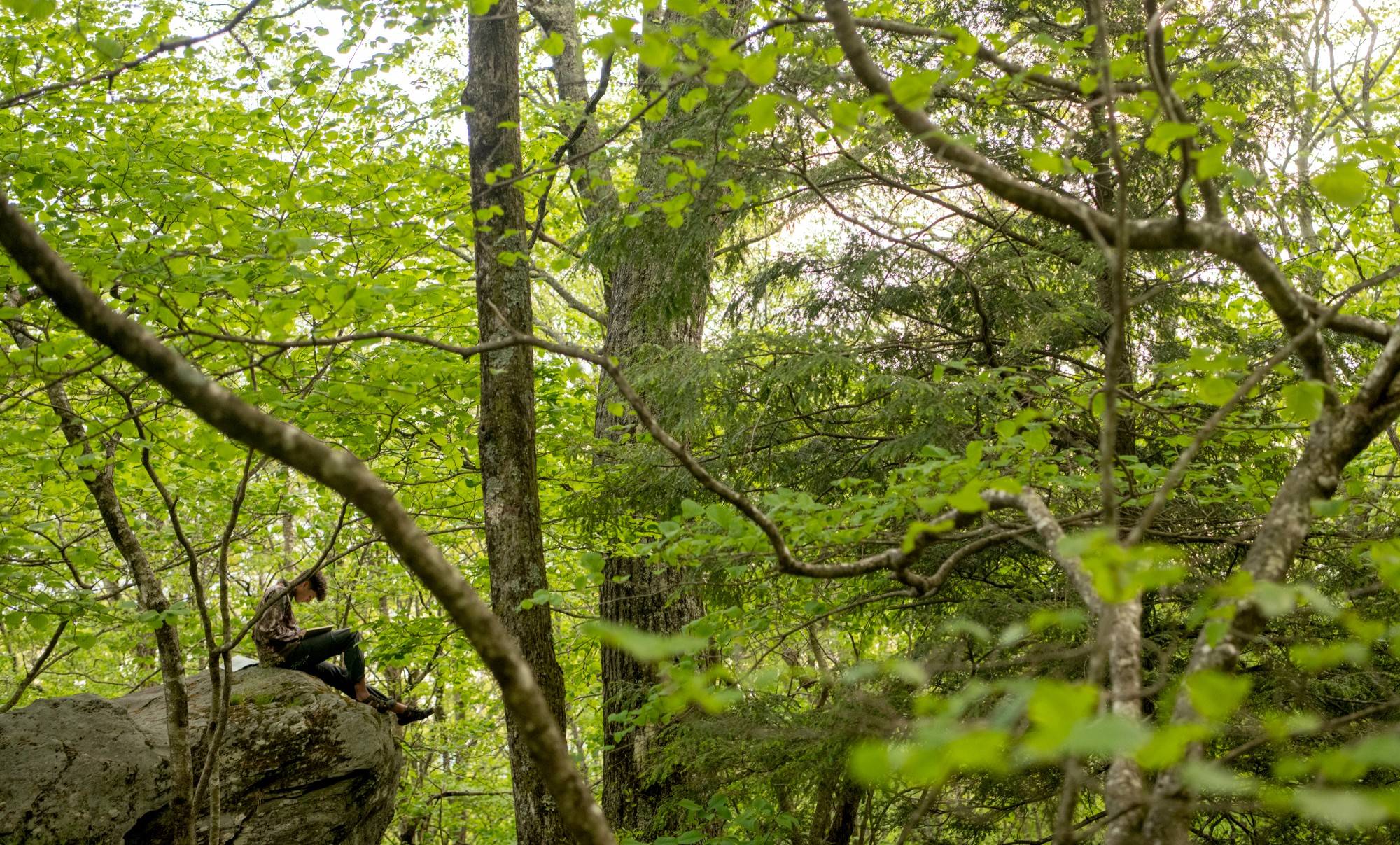 Andrew Lewis journals after arriving at a camp site on the Art Loueb Trail in the Pisgah National Forest.