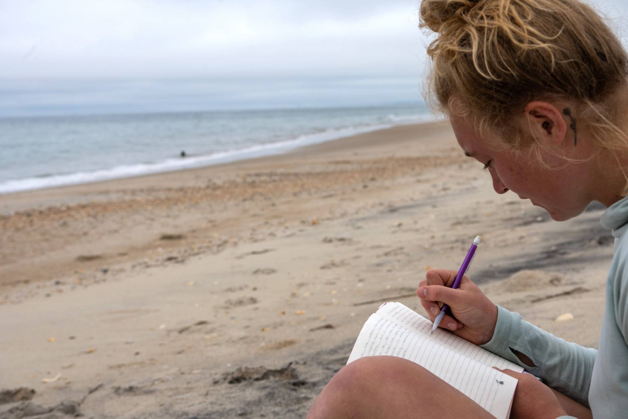 Anna Hattemer takes notes during a student-led lesson following a lunch break on the trail.