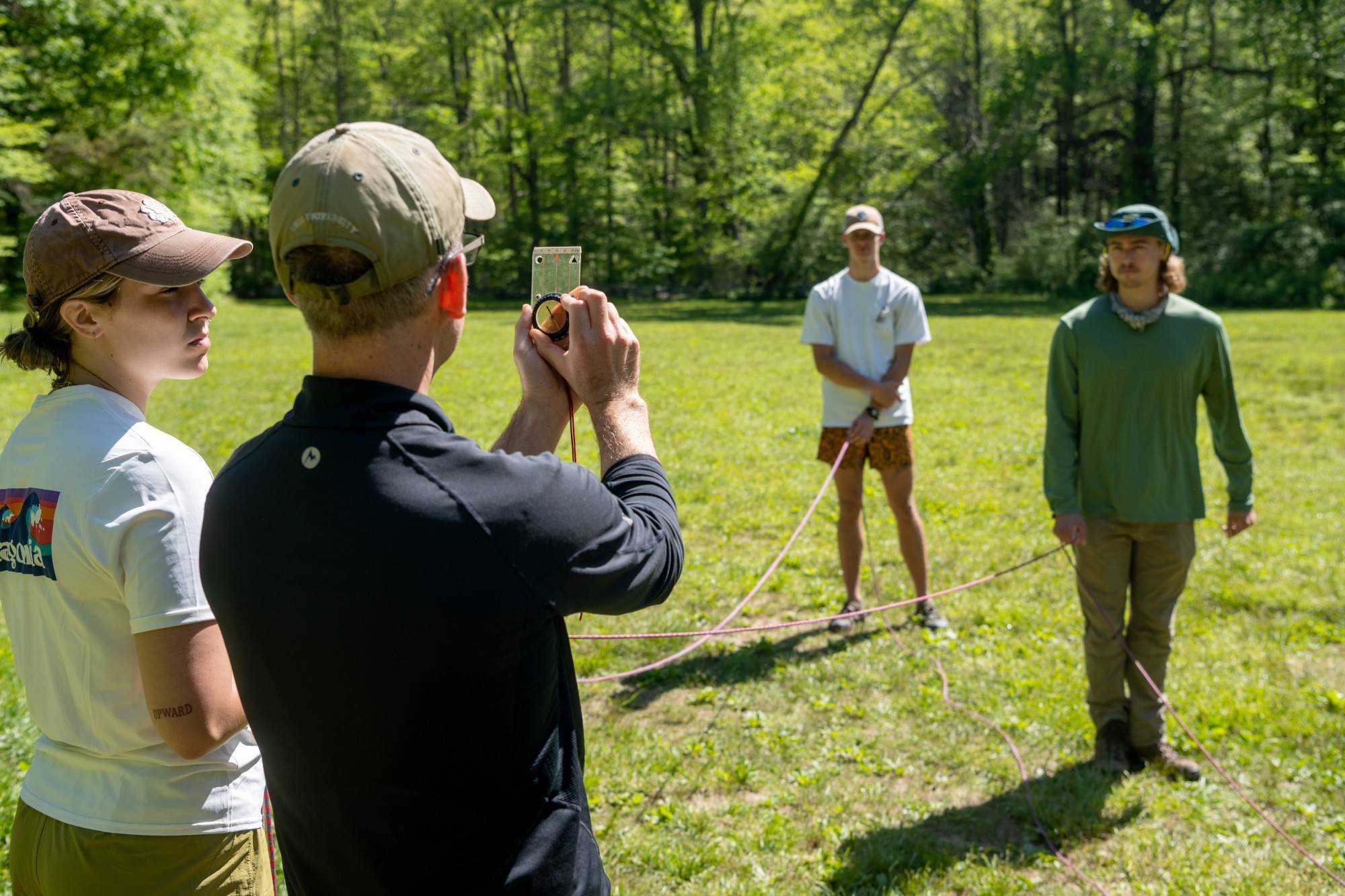 Associate Professor Andy Szolosi teaches students how to adjust their compasses for magnetic declination using climbing ropes as visual aides.