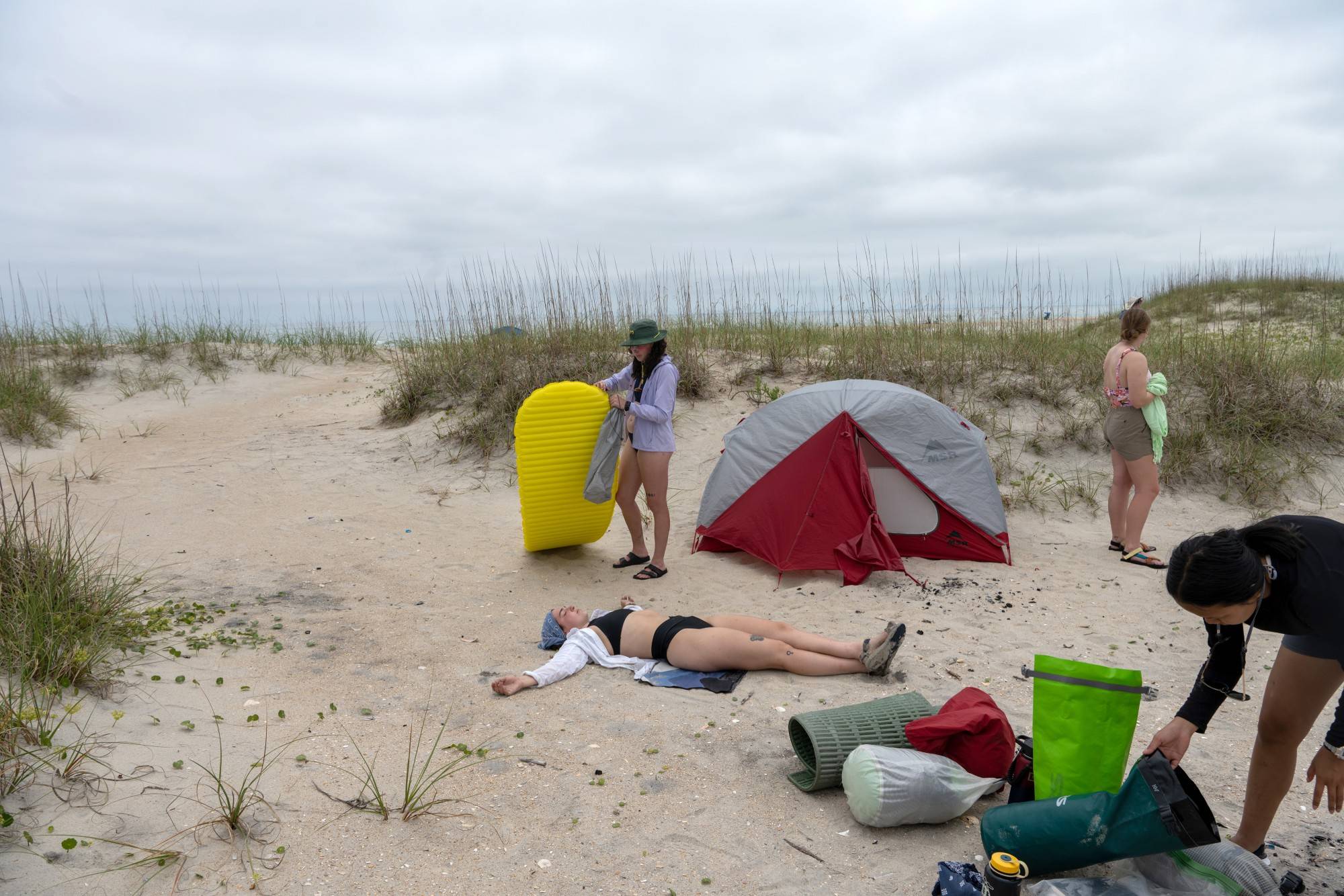 Students camped in the shadow of Cape Lookout Lighthouse on the third night in the Outer Banks. Autumn Warren rests for a moment after pitching her tent on the beach.