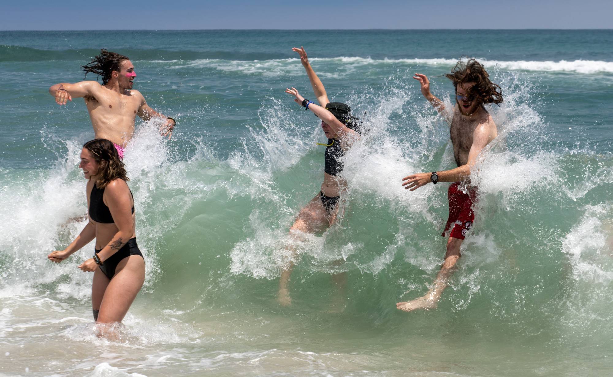 Students enjoy a swim in the ocean near Cape Lookout Lighthouse.