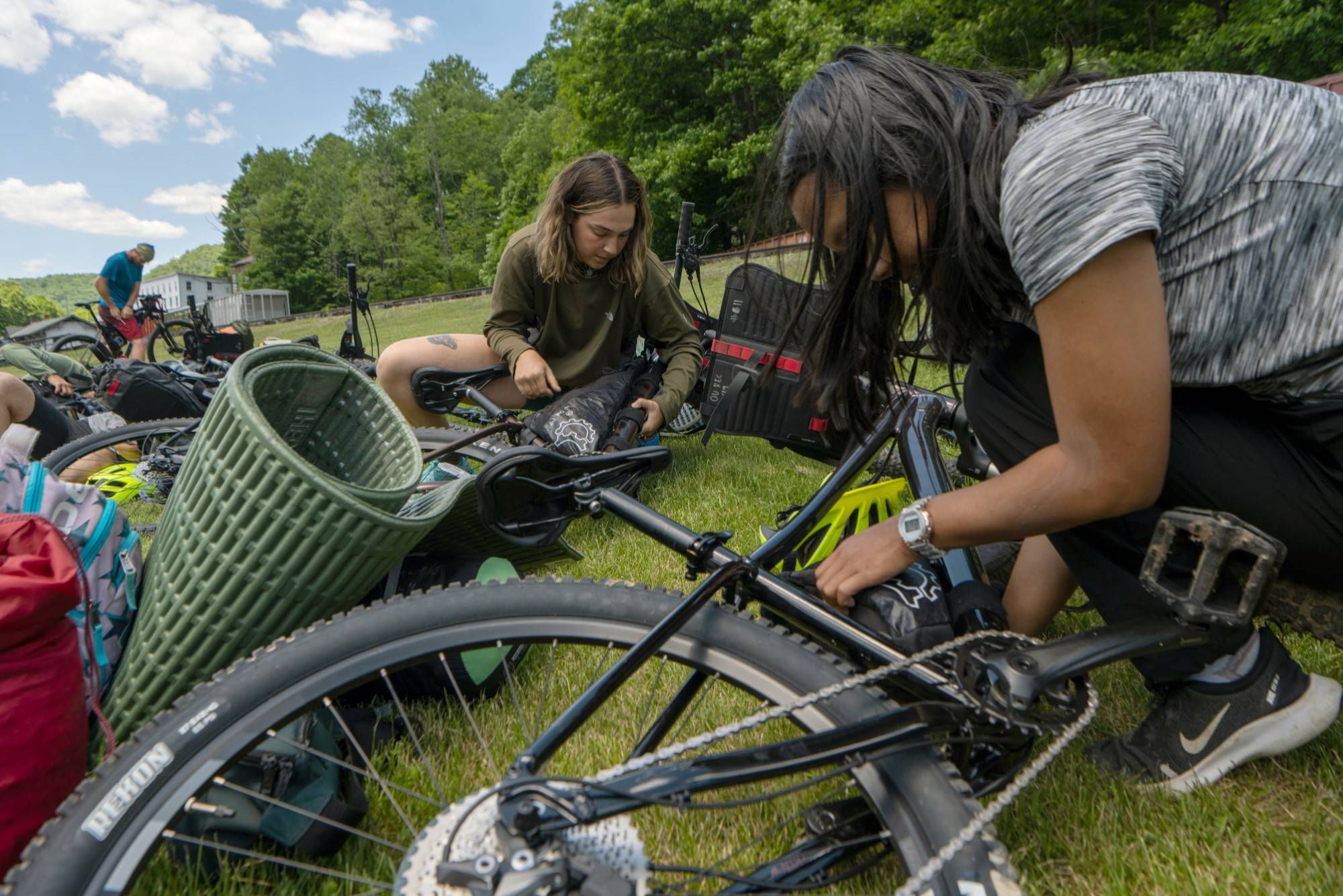 Autumn Warren (left) and Maya Snyder install bike-packing gear on their mountain bikes.