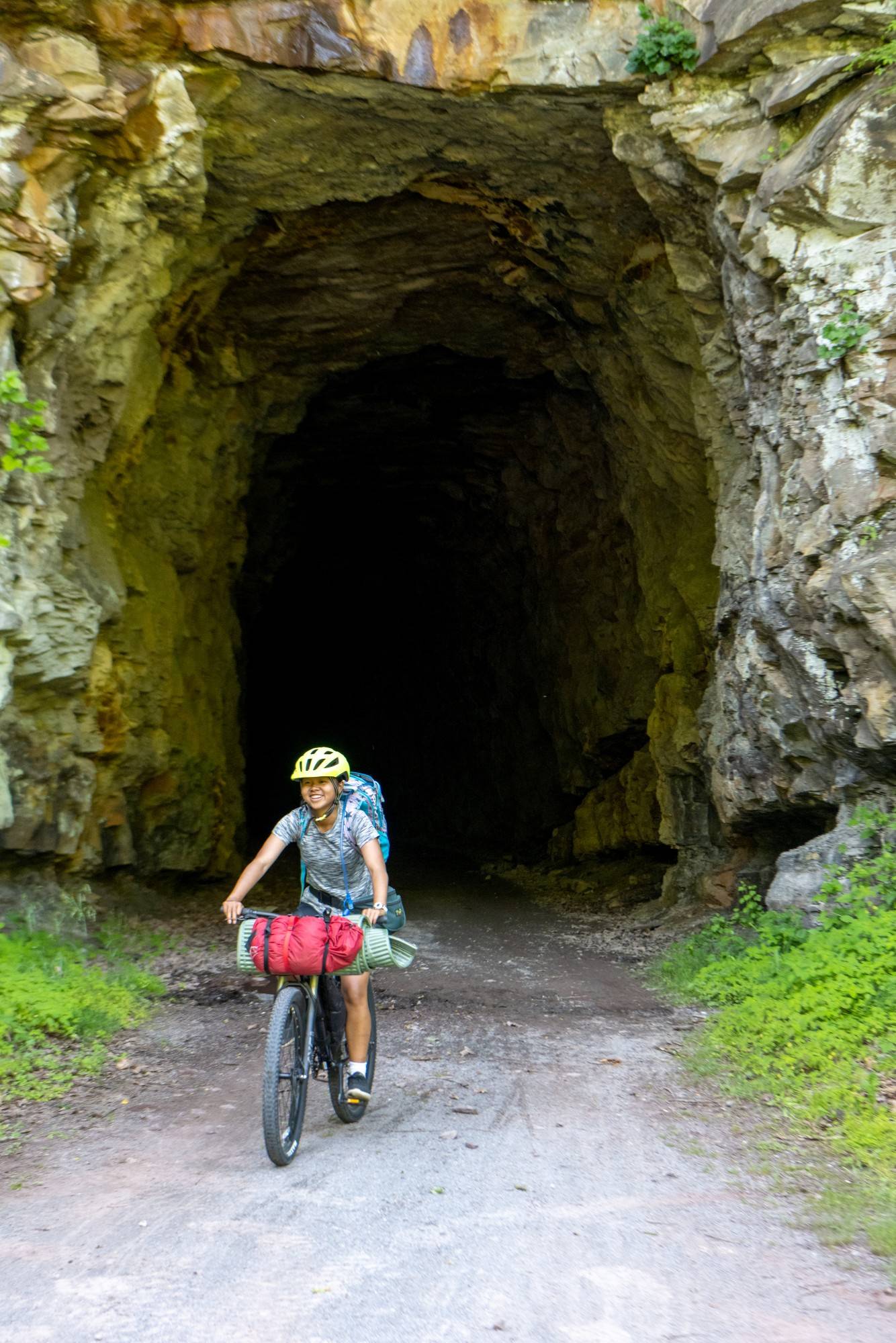 Maya Snyder bikes through a tunnel on the Greenbrier Rail Trail in Southern West Virginia.