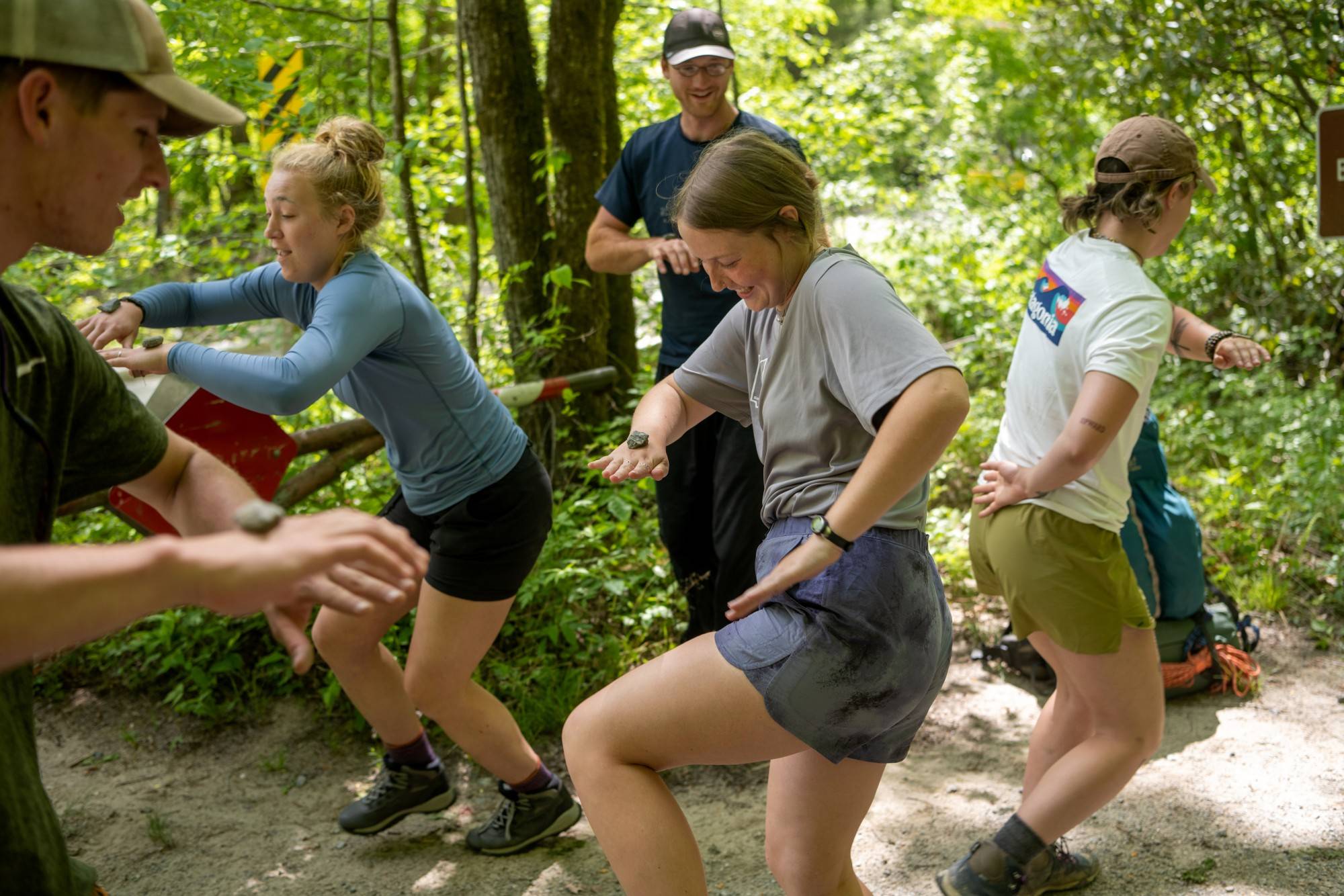 Graduate student Kevin Osborne (top center) leads the group in a game of Rocky Handy. Osborne said, "Part of being a leader is knowing when your team needs to have some fun. Rocky Handy became a favorite game to play during down times. These moments allowed students to laugh, be silly and relax with their one another. The bonds built during these games allowed the class to work together and face significant challenges as a group."