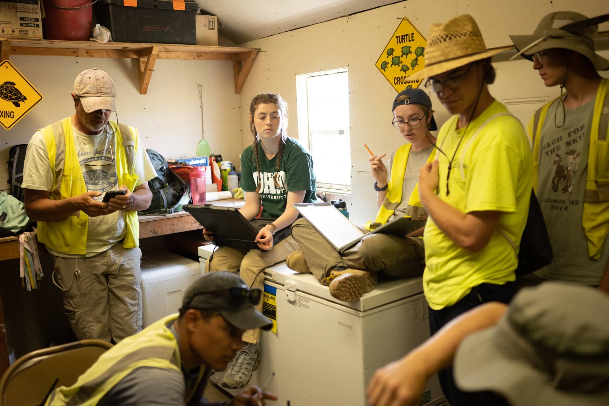 Five undergraduate students and two graduate students collaborate to meticulously collect and record turtle data in a shack on Poplar Island.