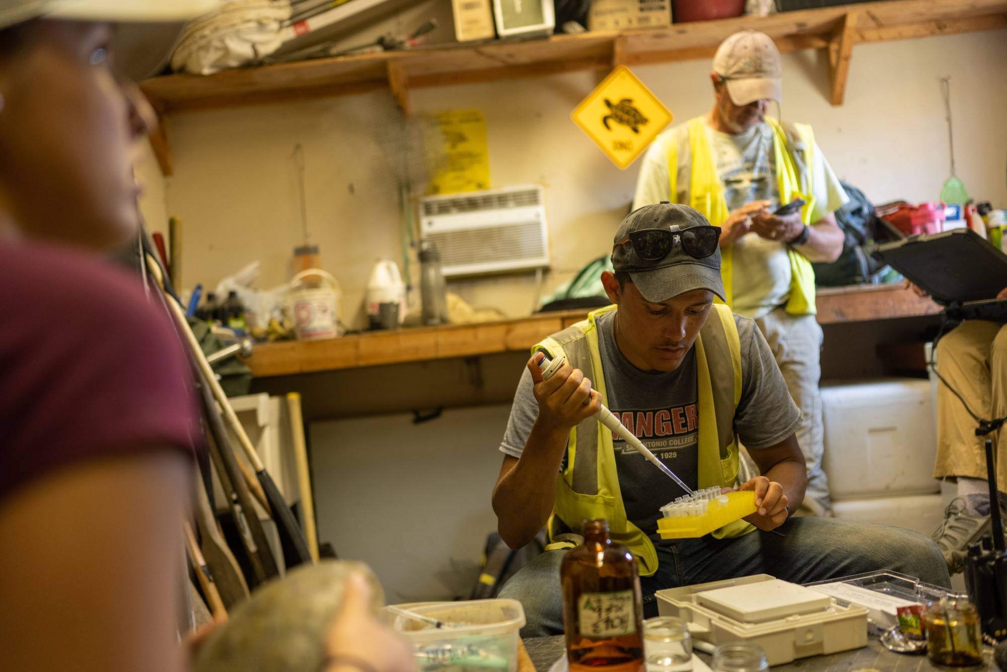 Graduate student David Cole collects prepares to collect DNA samples from the captured turtles.