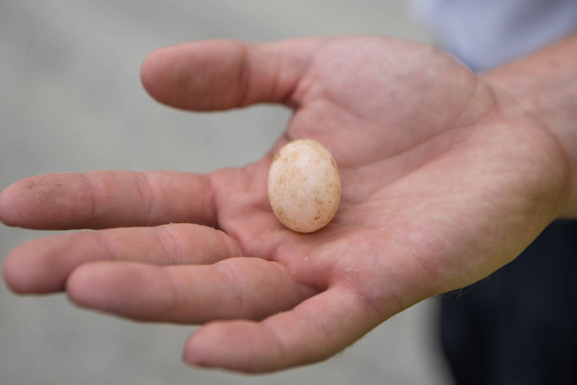 A student holds a turtle egg in their handle. Turtle eggs are counted and weighed and returned a nest, which researchers mark and fortify against predators. Turtle nests are occasionally relocated if they are found on a road or in another area that would be considered dangerous to the baby turtles.