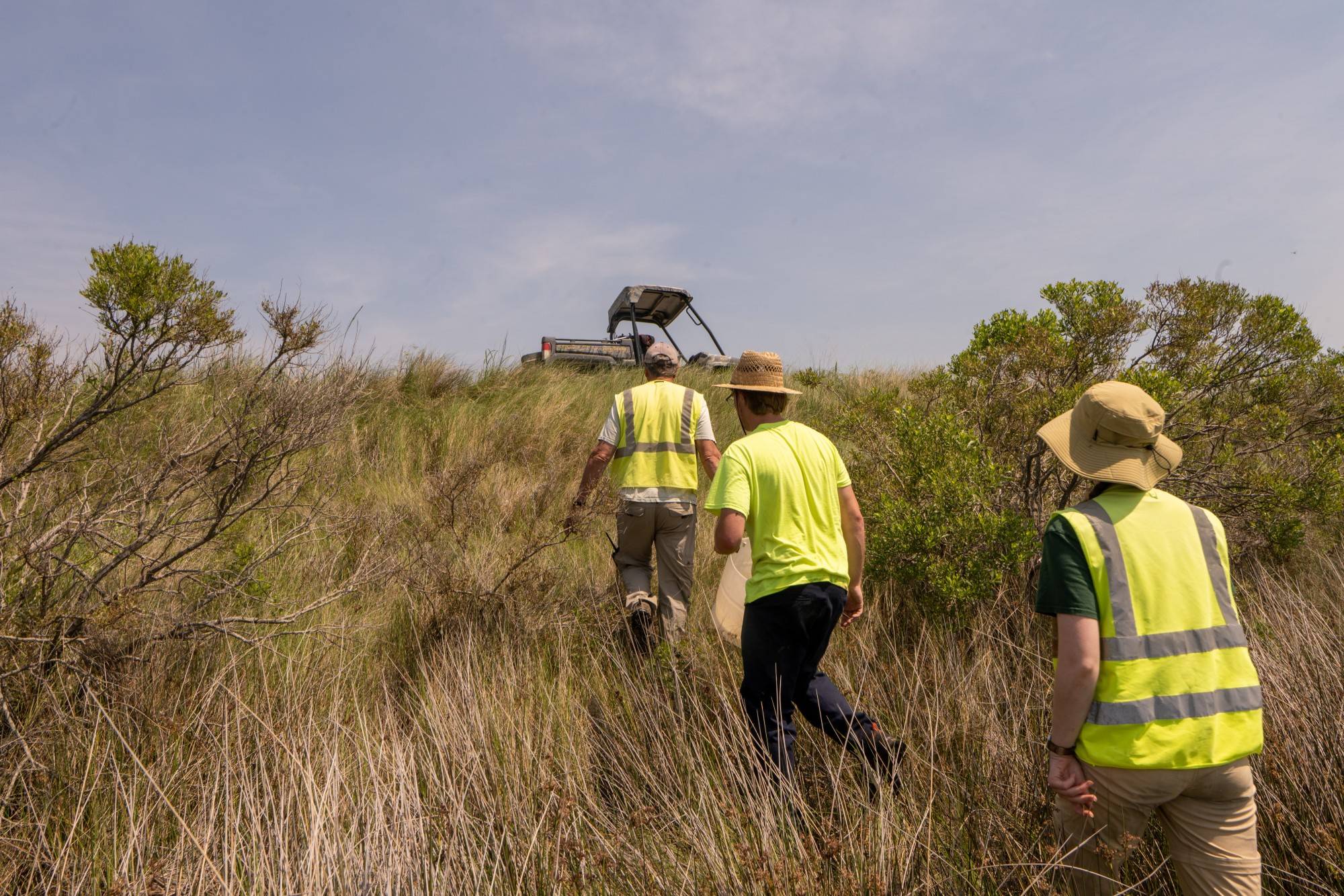 The crew makes it's way back to the vehicle after a long afternoon of searching for turtle nests in the sun.
