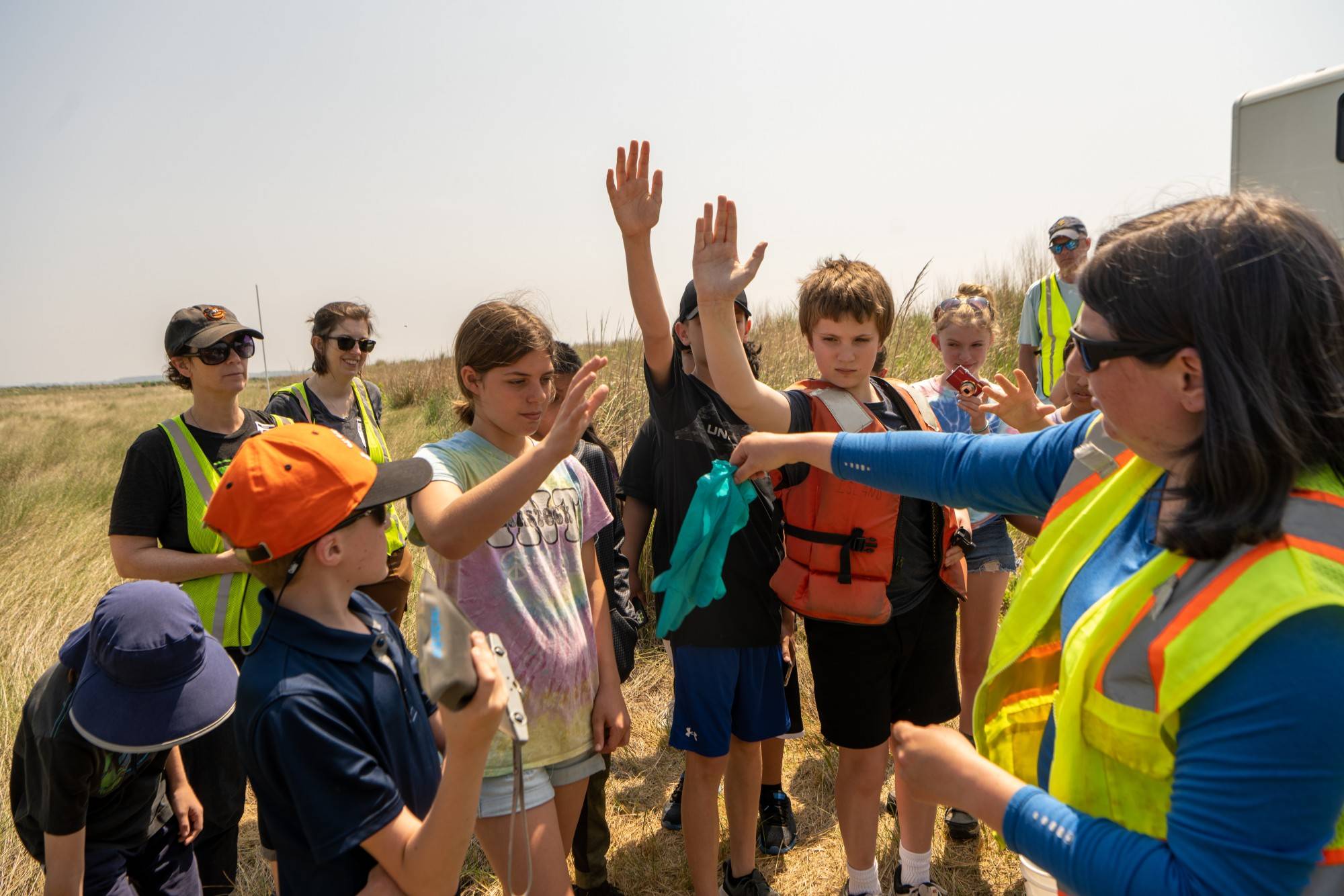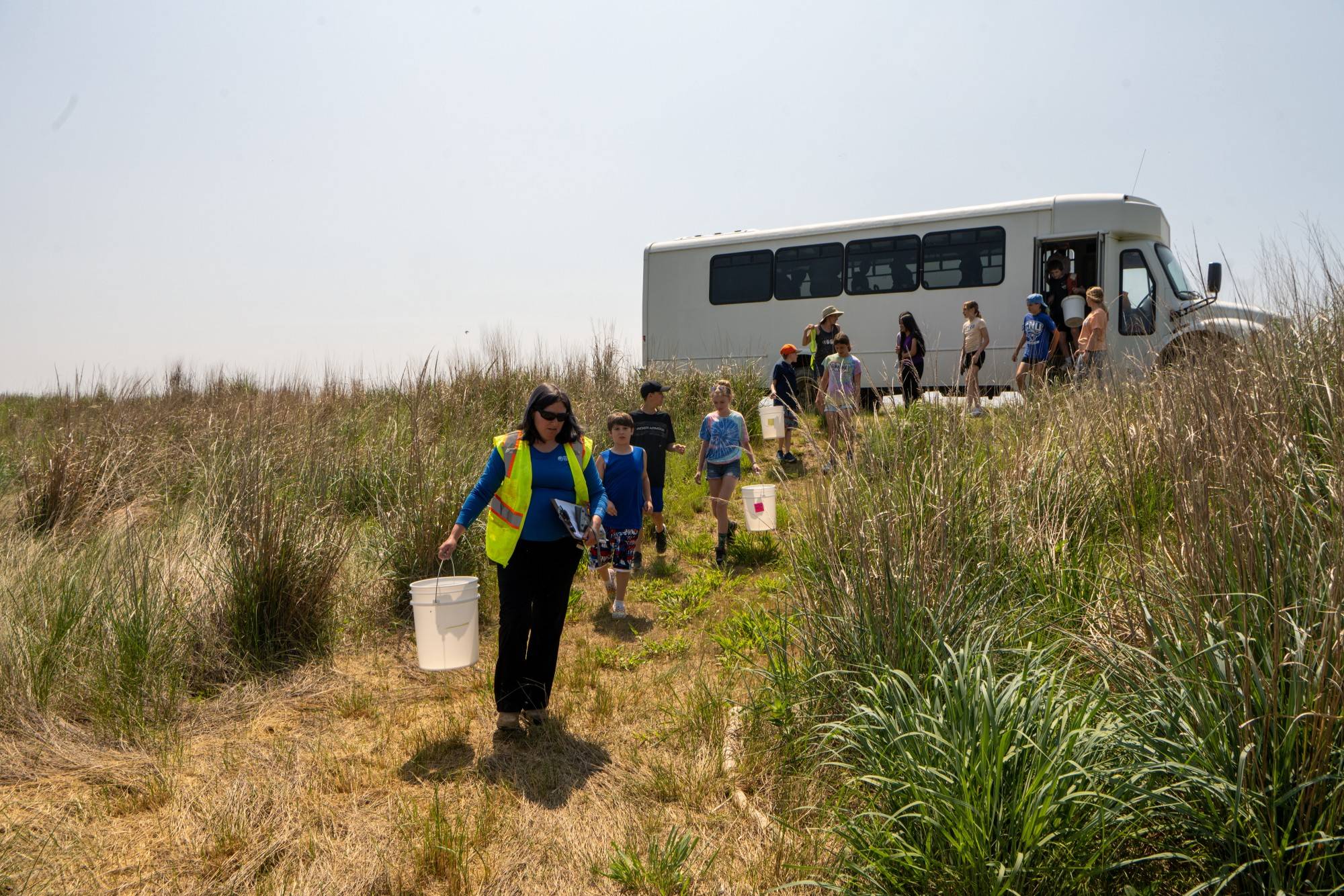 Senior Environmental Specialist Kristina Motley directs local grade school students on Poplar Island. Motley is collaborating with Dr. Roosenberg's team in an environmental education program called TERP (Terrapin Education and Research Partnership).