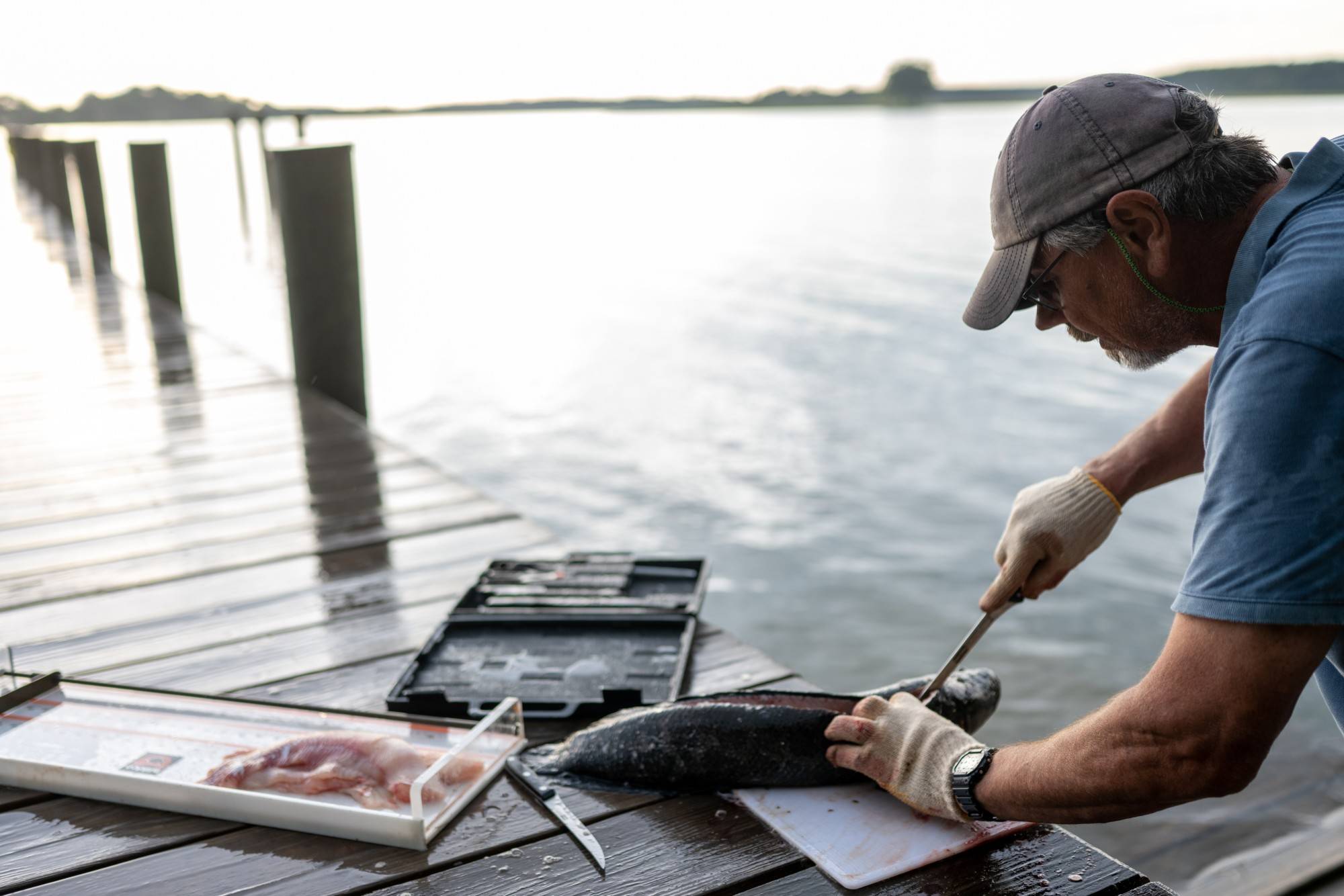 Dr. Willem Roosenberg prepares snakehead fish for dinner at the dock of his home. The fish was caught in a turtle trap on Poplar Island but research protocols prevent the team from returning the fish to the bay because it is an invasive species.