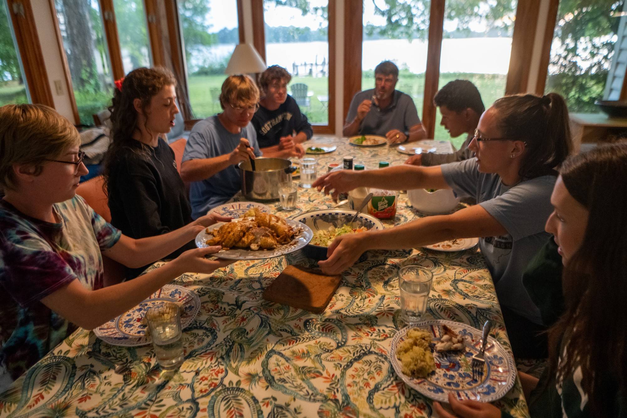 Students enjoy fresh caught snakehead fish family style at Roosenberg's home.