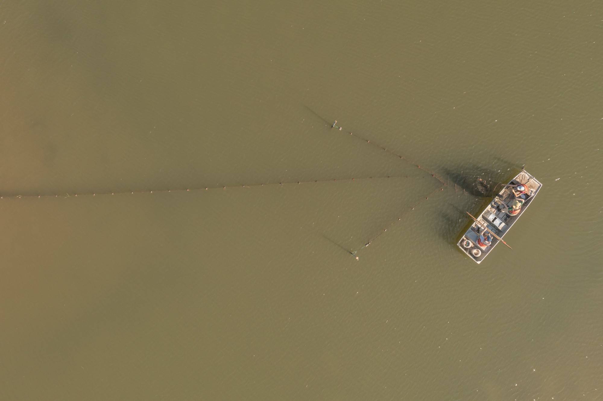 Undergraduate student Molly Haugen pulls a fyke net full of turtles onto a boat on Poplar Island.