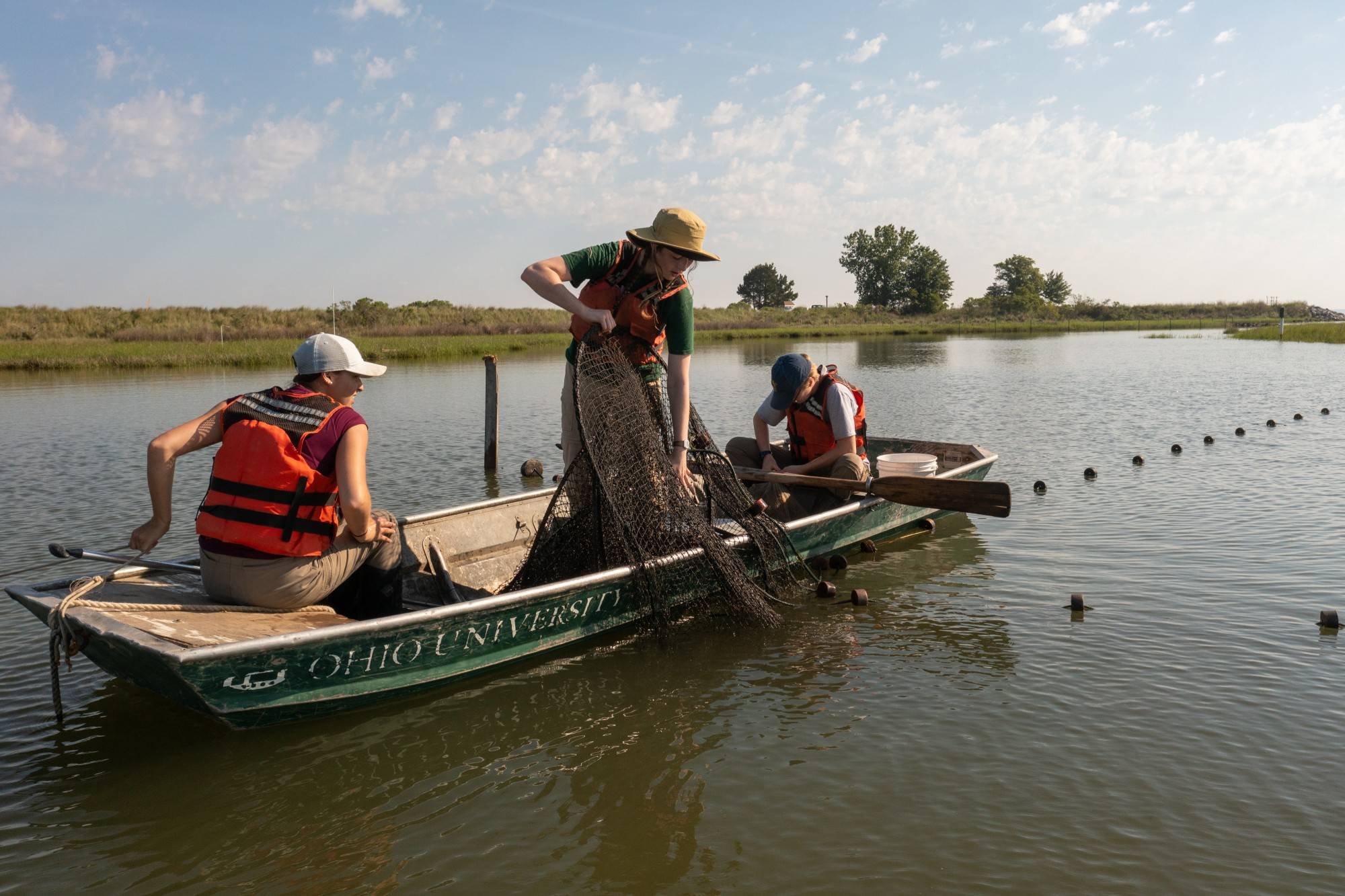 "The most challenging aspect of the summer had to be setting up the fyke nets in the cells," Fenohr added. "I tackled this task each week, and for the most part it was relatively simple and went smoothly, although there were a few Mondays when the wind was so strong that it would push the rowboat back considerably, which made it difficult to hammer the stakes that hold the nests into the muddy substrate of the channels."