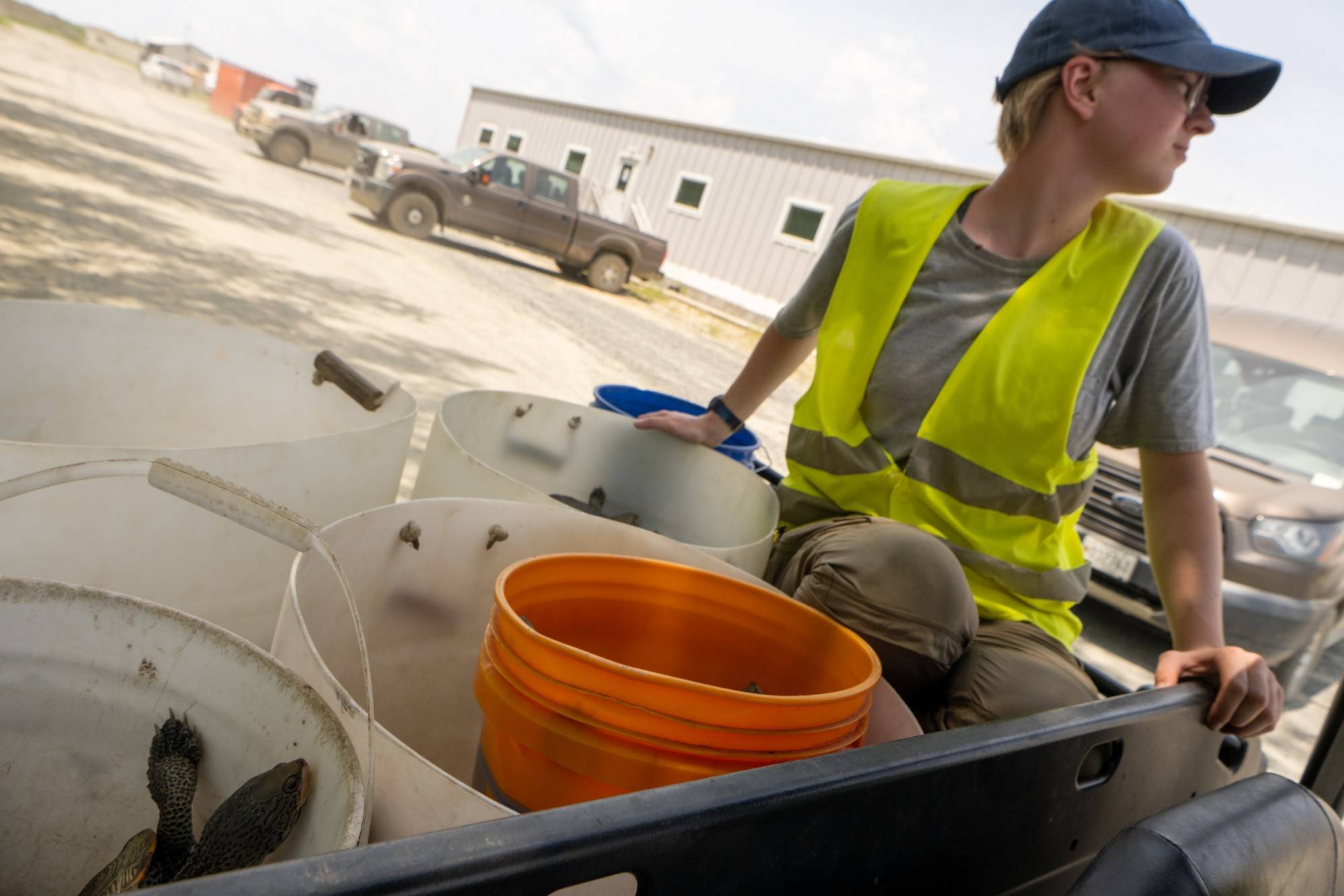 Undergraduate student Kendall Kuck watches over recently collected turtles in transit.