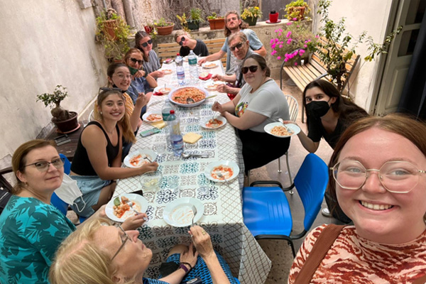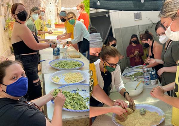Food in Sicily is open to undergraduate and graduate students, and students can earn six credit hours while learning how to make mozzarella, practicing Italian with a "Table and Market" meeting with local social enterprises, helping with dinners at a local soup kitchen, taking cooking classes, and visiting farms, breweries and wineries. (For additional information see the articles on Singing, Dancing and Churning the Cheese in Sicily during the 2019 trip, and Food in Sicily students experience how service changes people's lives and Food in Sicily students discover the power of community resilience during the 2022 trip).