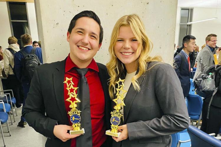 Both OHIO teams, the green team and the white team, competed in the ninth annual David Frohnmayer invitational hosted by the University of Oregon, with first-year students Ava Poling, a political science pre-law major in the College of Arts and Sciences, and Robertson Walker, an Honors Tutorial College political science major, winning outstanding attorney awards.