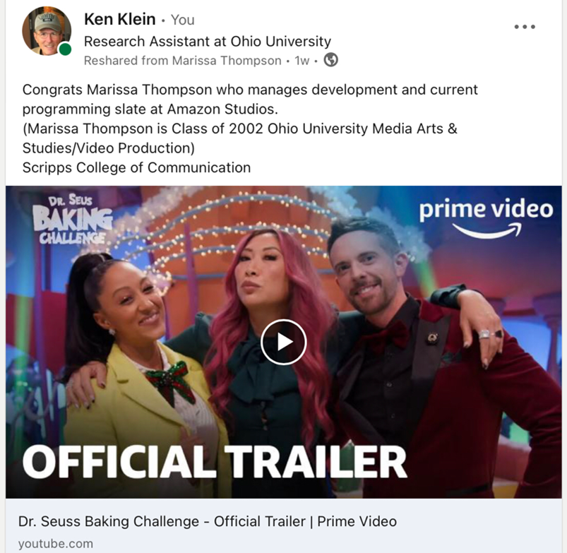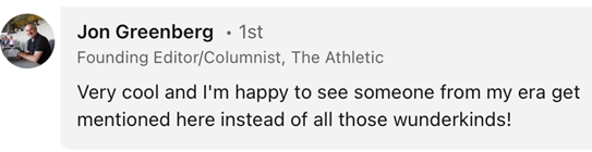 Jon Greenberg, Journalism ’01 graduate, is founding editor/columnist at The Athletic. He appreciated this Linkedin post about 2002 Media Arts & Studies alumna Marissa Thompson of Amazon Studios and posted this reply.