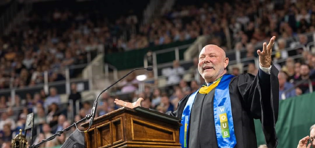 And that he did. While standing on stage in front of hundreds of students from the College of Business, the College of Fine Arts, the Russ College of Engineering and Technology, the Scripps College of Communication and University College, along with their family and friends, Collins wore the blue WOUB stole around his neck showcasing the value of the experiential learning he received working at the station as a student. Twenty graduating seniors who worked at WOUB were also wearing the WOUB stoles.