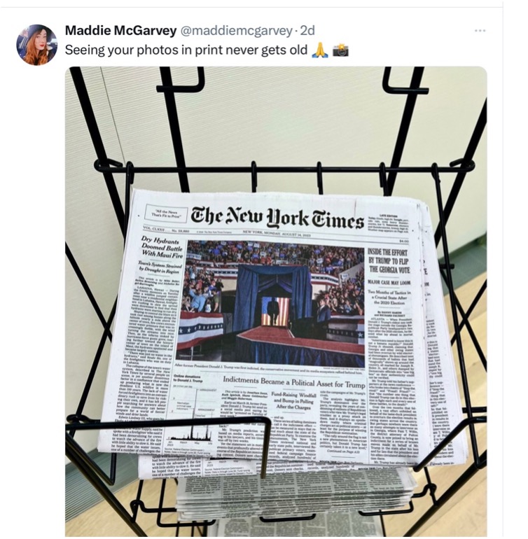 After the indictment of former President Donald Trump in Georgia, The New York Times published a front-page picture of Trump by Columbus-based freelancer Maddie McGarvey (VisCom ’12).