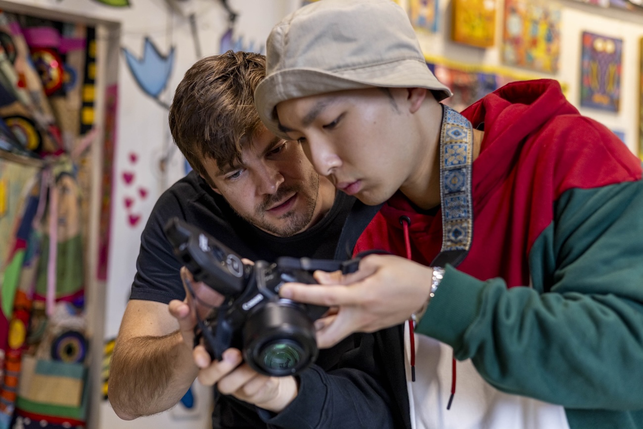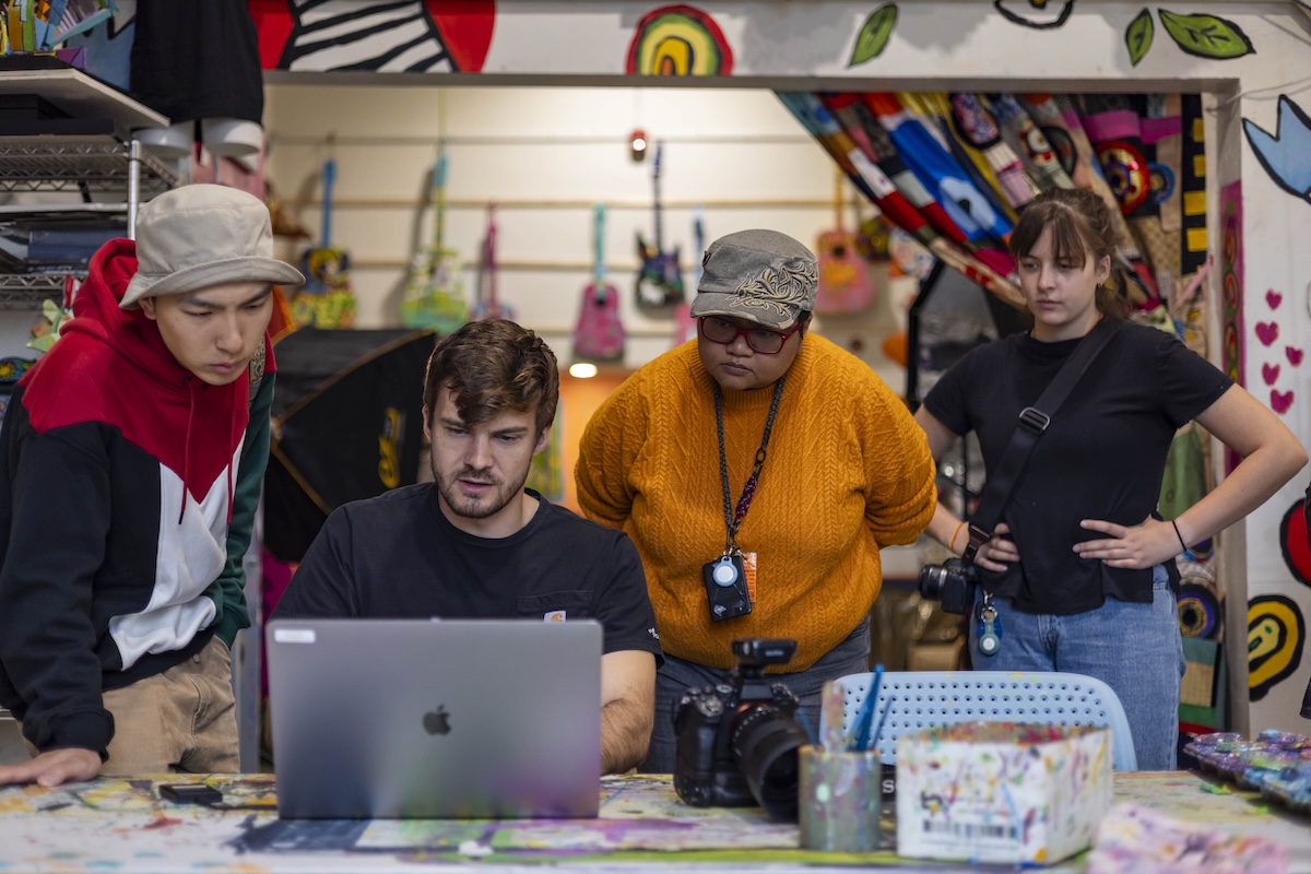 Visiting photojournalist Nic Antaya works with NPPAOU members during a photo shoot at Passion Works Studio in October, 2023