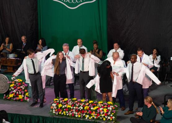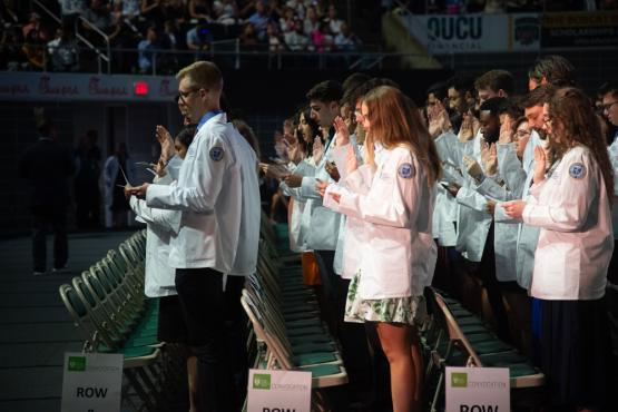 The white coat ceremony is held each year during orientation to introduce the entering class. More than 4,500 prospective students applied to the college this year for 260 spots in the Heritage College’s Class of 2028. Of those admitted, more than 92 percent are from Ohio, 32.5 percent are from groups underrepresented in medicine, and 17.5 percent are first-generation college students.