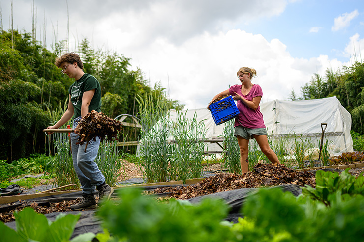 OHIO Student Farm Interns Lindsey Copeland (left) and Kaya Stone (right) spread leaf compost sustainably collected from University landscaping.