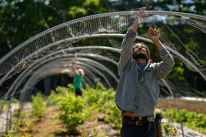OHIO Student Farm Manager Tony Noble (foreground) and a Student Farm intern hang netting over crops.