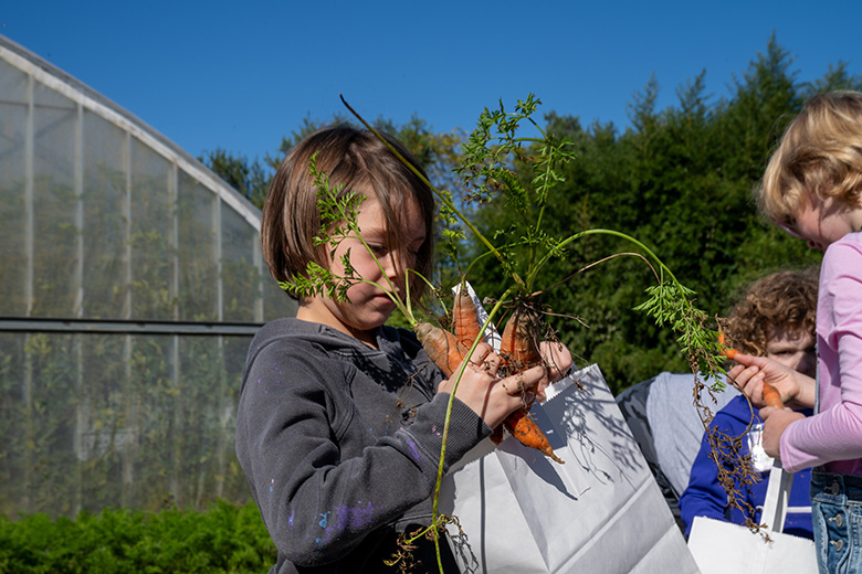 An Athens-area first-grade student holds carrots harvested from the OHIO Student Farm as part of Community Food Initiatives' Sprouts program.