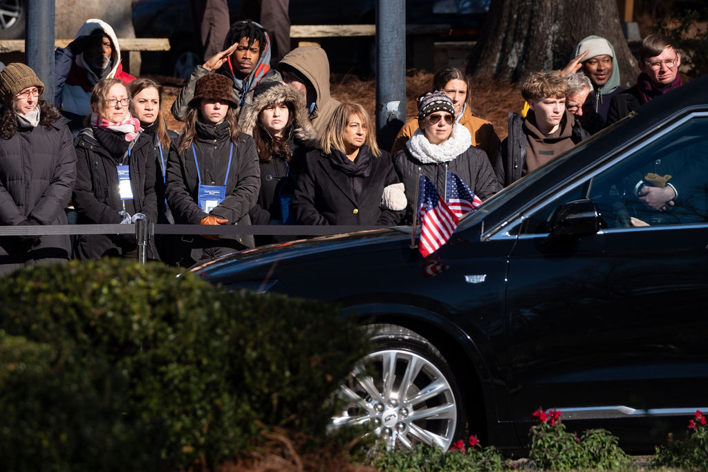 Mourners watch President Jimmy Carter's funeral procession passes, with some standing at attention, saluting—a final tribute to a leader who dedicated his life to service.