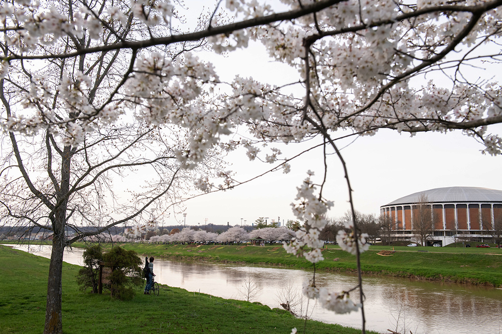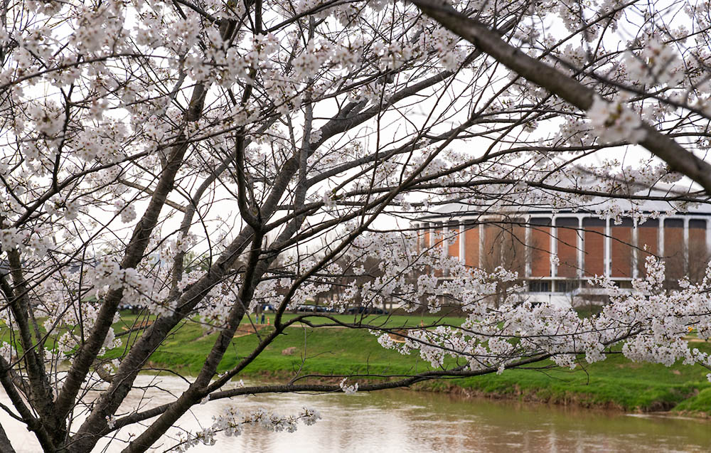 Cherry trees in bloom decorate the Athens campus and endure spring floods