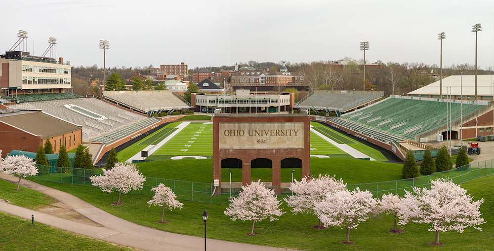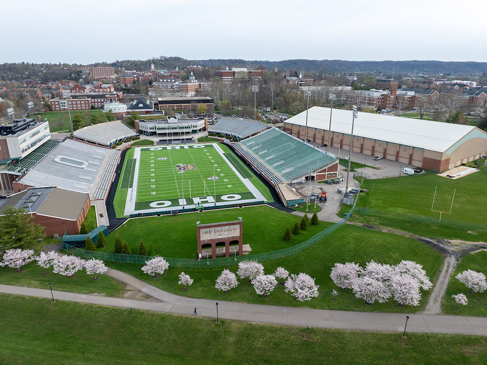 From above, Peden Stadium with cherry blossoms lines the bike path on the southern edge of campus.