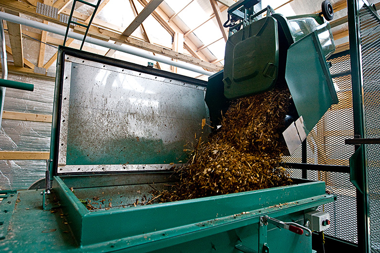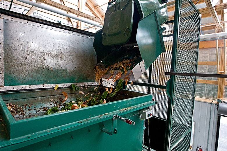Compost bins are collected five days a week and taken to the facility where they are weighed for data collection purposes then raised up and dumped into one of the two vessels. The fruit and vegetable scraps, coffee grounds, eggshells and other organic waste are then mixed with wood chips to create a chemically balanced mixture. This mixture is constantly turned and heated to create an oxygen-rich environment that aids the decomposition process and further reduces bad bacteria.