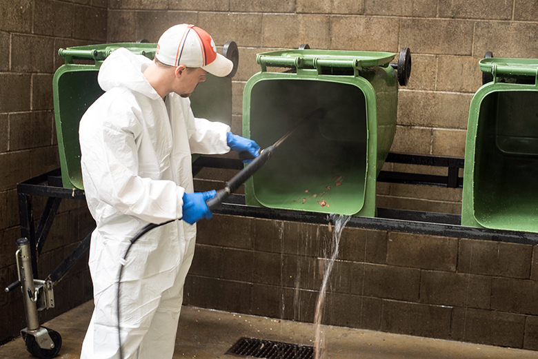 All Ohio University compost bins are power-washed with recycled rainwater before being returned to the dining halls.