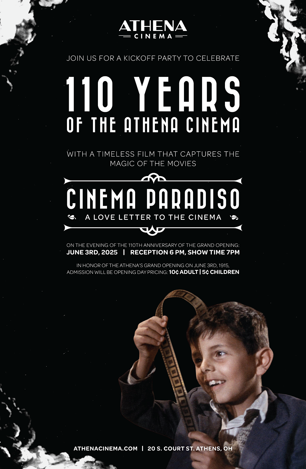 The Athena Cinema invites all of Southeast Ohio to this once-in-a-lifetime celebration on the evening of June 3. In honor of its first screening, and in celebration of the historic occasion, tickets for “Cinema Paradiso” will be available to the public for just 10 cents and will be preceded by a small reception.