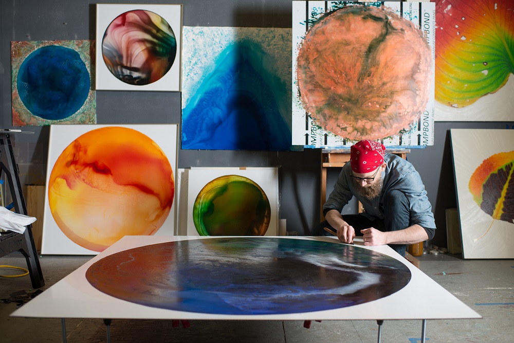 Artist activist John Sabraw is working to return southeastern Ohio’s streams to the picture of health. Sabraw has partnered with Dr. Guy Riefler, Professor of Civil Engineering at Ohio University to extract toxic acid mine drainage (AMD) from polluted streams and turn it into paint pigment. Once the pigment is sold on a commercial scale, revenue will be invested back into the streams’ remediation. Sabraw tells the pigments’ story via his circular artwork.